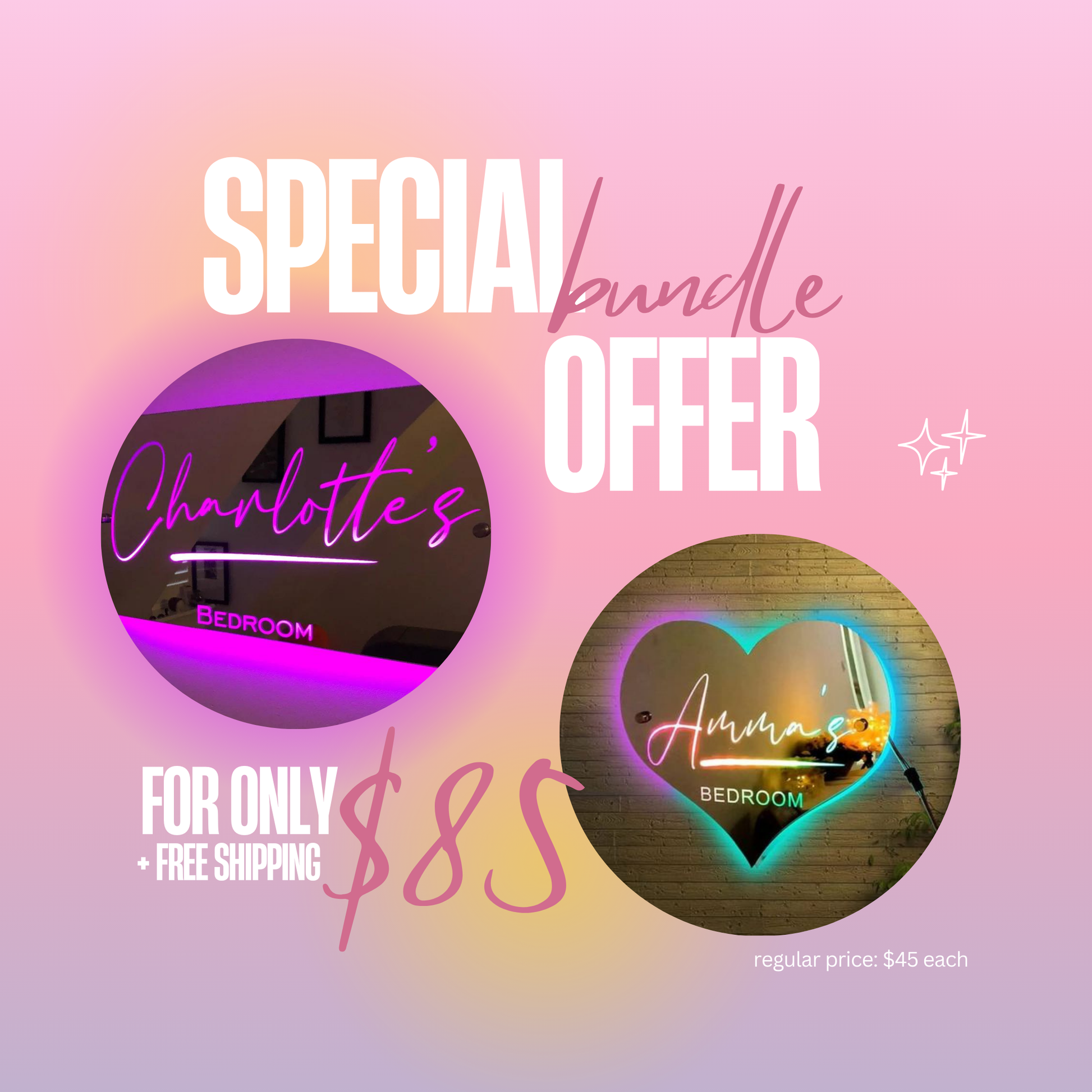 Each mirror is originally $45, but with this bundle, you save $5. Enhance your space with our stylish, customizable LED mirrors. Order now and add a personal touch to your decor!